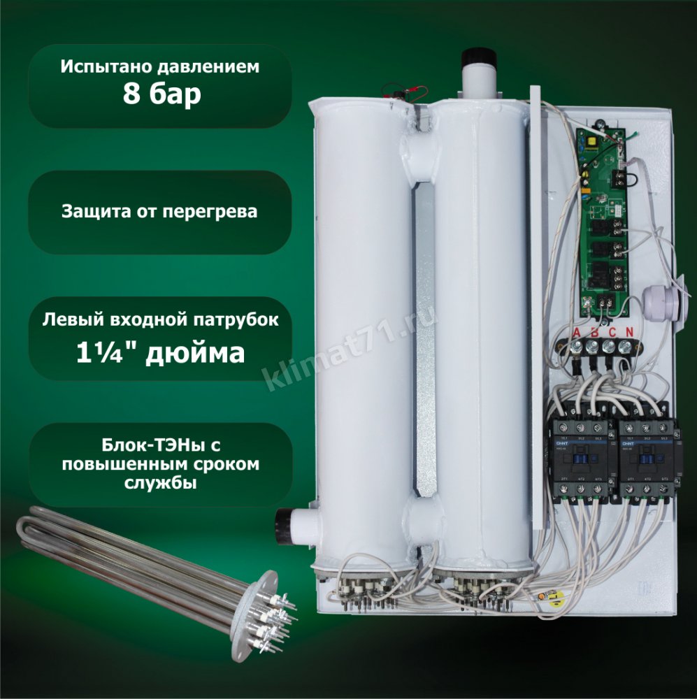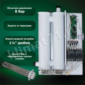Электрокотлы ЭВН-К «КЕЛЕТ» предназначены для нагрева и автоматического поддержания заданной температуры теплоносителя в автономных системах отопления зданий в районах с умеренным и холодным климатом. Электрокотлы совместимы с котлами, работающими на твердом, жидком или газообразном топливе. С успехом решают задачи основного, дополнительного или резервного котла отопления. Рабочее давление в системе отопления 3,5 атм. КПД – 98%. Специально разработанные блок-ТЭНы имеют повышенный срок службы – до 7500 часов.